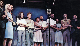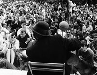 Building on the success of an annual summer jazz festival, the Newport Folk Festival began in 1959. The festivals people remember, though, began in 1963, when Pete Seeger and his wife Toshi, along with George Wein and Theodore Bikel, came up with a new model: a festival where popular stars would be paid the same as unknown rural performers, and the crowds that came to see the familiar names would be introduced to a world of unfamiliar traditional music. For hardcore folk fans, the big news of the '63 festival was the reappearance of Mississippi John Hurt, a legendary singer who had first recorded in 1928, but for young listeners who heard folk music as the sound of their times, the iconic moment came at the end of the first night's concert, when Dylan--a 22-year-old songwriter still barely known outside New York--was joined onstage by Seeger, Joan Baez, Peter, Paul and Mary, the Freedom Singers, and Bikel, linking arms and singing "Blowin' in the Wind" and "We Shall Overcome."