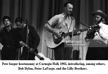 The early 1960s was a time of optimism and paranoia, hope for a future of racial equality and fear of no future at all. In the southern freedom movement, folk music found a new purpose--Seeger connected a young singer-guitarist named Guy Carawan to the Highlander School in Tennessee and they spread a song Seeger had learned from a previous Highlander songleader, called "We Shall Overcome." In New York, Seeger suggested that Sis Cunningham start a biweekly topical songsheet called Broadside to encourage new songwriters, and Dylan became one of its most prolific contributors. His first compositions were mostly in Guthrie's style, but in the summer of 1962 he wrote "Blowin' in the Wind," and that fall Seeger introduced him at Carnegie Hall for a set that opened with a blues harmonica hoedown and a song based on a guitar riff from the Everly Brothers, but also included "A Hard Rain's A-Gonna Fall."